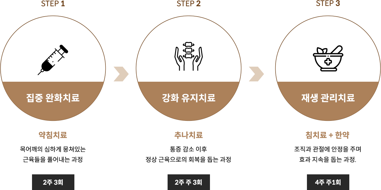 경추간판탈출증은 목뼈 사이의 디스크가 탈출되어 신경에 염증을 일으키거나 눌러서 목, 어깨, 팔 등으로 방사통(radiating pain)이라고 불리는 통증과 저림 등의 증상을 유발하는 질환입니다. 신경 손상이 심할 경우 팔의 감각이 이상해지거나, 근육의 힘이 안들어가며 떨리고 마비증상이 오기도 합니다. 경추추간판탈출증에 있어서 중요한 점은 손상된 조직을 회복시키고, 주변 근육을 재생시키는 치료를 통해 재발하지 않도록 관리하는 것입니다.