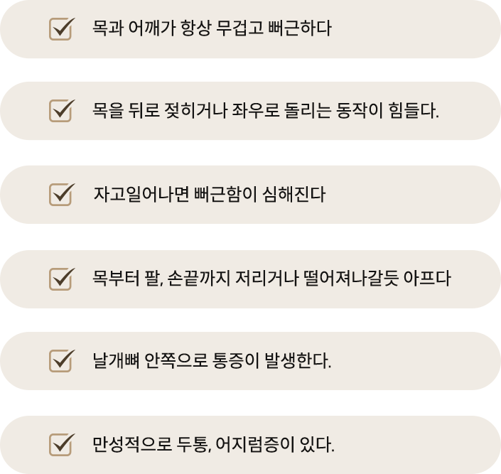 어깨가 무겁고 자세가 안 좋으시다면 삶의 질이 크게 떨어집니다. 목 디스크, 일자목, 거북목, 라운드 숄더 등의 문제는 한방 치료로 훨씬 편안해질 수 있습니다.