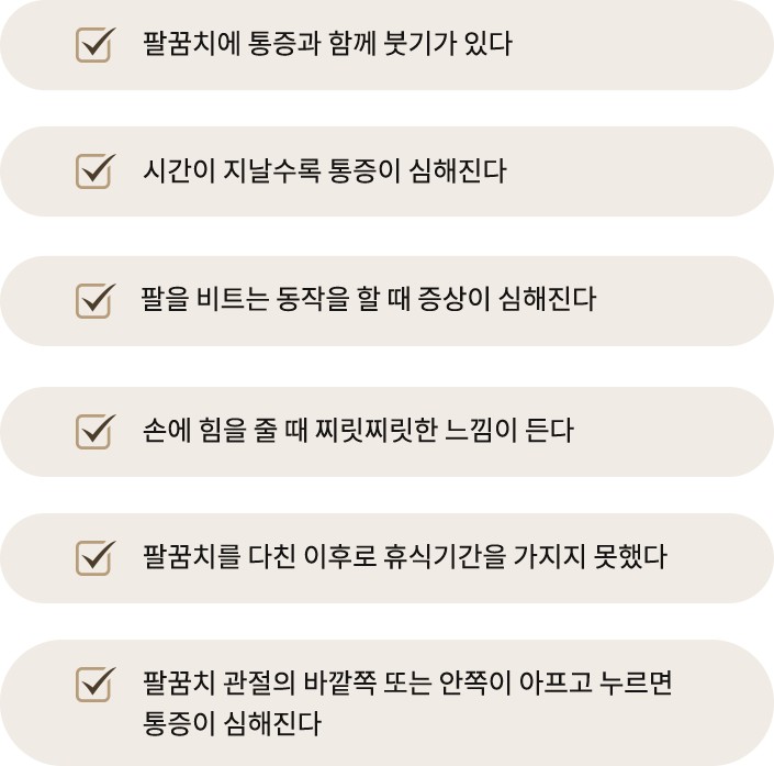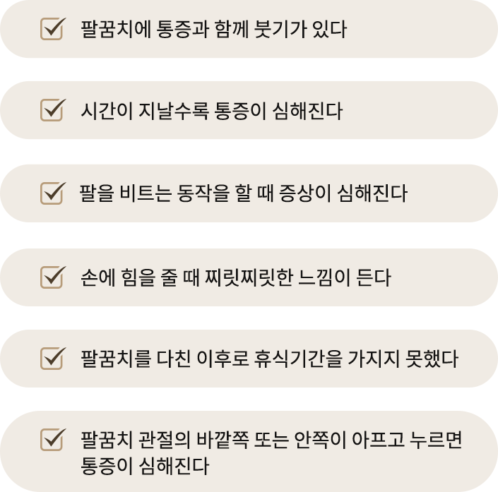 손을 많이 쓰거나, 골프나 테니스 등의 운동을 많이 하는 경우 팔꿈치에 통증이 발생할 수 있습니다.