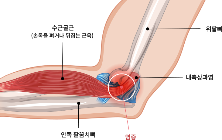 힘줄부분에 만성 염증이 발생하고, 팔꿈치의 내측상과에