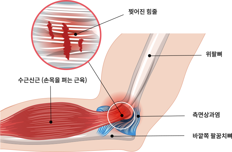 테니스 엘보의 정식 명칭은 주관절 외측상과염입니다. 손목을 뒤로 젖히는데에 사용되는 근육을 수근신근이라 부르는데 여기에 과부하가 생기면서 근육이 붙는 부분인 외측상과, 즉 팔꿈치 바깥쪽에 염증이 생기며 통증이 발생하는 질환입니다.